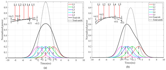 In order to analyze the reason for the echo change in the width and peak shift, a laser beam is regarded as a set of five sub-rays (L1~L5). After each sub-ray is reflected by the target, these sub-rays are accumulated at the detector to form an echo of this laser beam. The echoes reflected from a plane and an inclined plane are shown in Figure 16a. When the plane is not tilted, the TOFs of the reflected echo of these sub-rays are the same. Therefore, the pulse width and the center position of the echo formed by the superposition of five sub-rays are not changed, as shown by the dotted line in Figure 16a. When the plane rotates an angle counterclockwise, the optical paths of L1 and L2 increase, i.e., the TOF increase, while the optical paths of L4 and L5 decrease, i.e., the TOF decrease. The central position of the echo of each sub-ray, therefore, is separated, and the pulse width of the echo accumulated of five sub-rays is broadened, as shown by the black solid line in Figure 16a. The echoes reflected from a sphere and an inclined sphere are shown in Figure 16b. Similarly, when the sphere rotates an angle counterclockwise, the optical path of each sub-ray is changed, which leads to the pulse width broadening of the echo accumulated of five sub-rays. In contrast to the case where the plane is tilted, the height of each point on the spherical surface is not the same. When the sphere is tilted, the absolute values of the changed optical paths of L1 and L2 are not equal to that of L4 and L5. It causes the center position of the echo accumulated of five sub-rays to be shifted, as shown by the black solid line in Figure 16b.