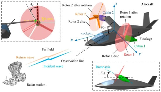 The schematic diagram of the dynamic electromagnetic scattering of the tiltrotor aircraft is shown in Figure 1, where Ac1 represents the tilt angle of cabin 1, α represents the azimuth angle between the radar station and the aircraft, β represents the elevation angle between the radar station and the aircraft [29,30,31,32], Ar1 is the rotation angle of rotor 1. In fixed-wing mode, the rotation of the rotor and the tilt of the rotor cabin will change the radar stealth characteristics of the aircraft [33,34], especially in the heading direction.