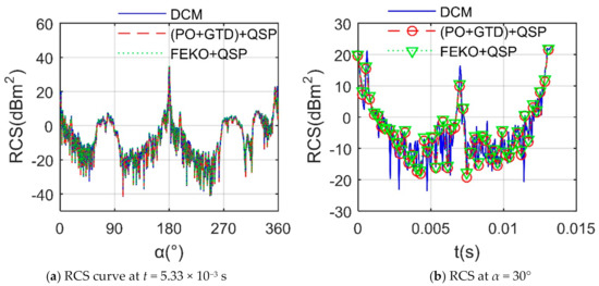 Verification of DCM on rotor 1, β = 0°, frh = 10 GHz, nr1 = 1500 r/min, Ac1 =0°. (a) RCS curves at t = 5.33 × 10−3 s. (b) RCS curves at α = 30°.