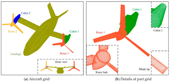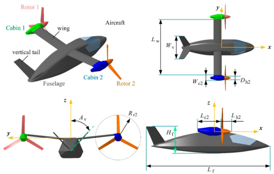 The model of the tiltrotor is established as shown in Figure 3, where the length of the aircraft fuselage Lf = 16.1 m, the height of the fuselage Hf = 3.51 m, the length of the wing Lw = 11.8 m, the inclination angle of the vertical tail Av = 42.92°, the distance between the tops of the vertical tails Wv = 4.87 m, the radius of rotor 2 Rr2 = 3.1 m, noting that the size of rotor 1 and rotor 2 are the same. The length of the rotor 2 hub Lh2 = 1.4 m, the diameter of the rotor 2 hub Dh2 = 0.8 m, the length of cabin 2 Lc2 = 3 m, the width of cabin 2 Wc2 = 1.15 m.