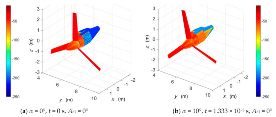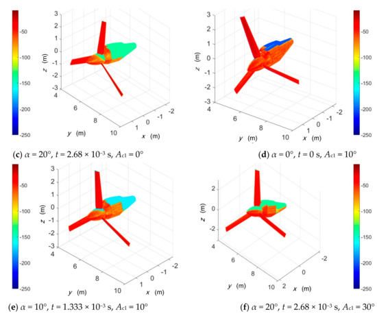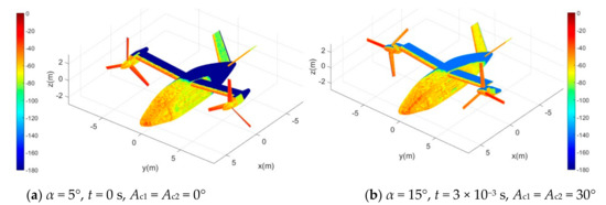 For the Figure 9a, under current conditions, the blades have the most obvious electromagnetic scattering characteristics, because the two rotor disks are perpendicular to the incident wave at this time, which makes each blade’s ability to deflect radar waves very weak. Note that the closer the color of the surface is to red, the larger the RCS of the face element is and the closer to the blue, the smaller the RCS of the face element is. At the leading edge of the wing, the curvature of the curved surface here varies greatly and there are many facets that are not conducive to deflecting radar waves; thus, the RCS level here is relatively high. In the indirect illumination area, the facets here do not receive the first illumination of the incident wave; thus, their scattering intensity is at the lowest level, showing blue and dark blue. When the cabin inclination angle is increased to 30° as shown in Figure 9b, the surface electromagnetic scattering characteristics of 2 blades on each rotor are significantly reduced. At this time, the azimuth angle increased to 15° and the original red of the leading edge of the wing was transformed into orange–red.