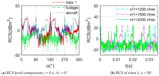 Due to the initial stealth design, the fuselage has achieved better low RCS performance as shown in Figure 7a, where Ac2 represents the tilt angle of cabin 2, the electromagnetic scattering level of the entire aircraft is higher than that of the rotor and the fuselage, because it superimposes the RCS of the fuselage, two rotors and their cabins in phase. For the Figure 7b, the RCS of the rotor under different rotation speeds all show obvious dynamic and periodic characteristics and the increase of the rotation speed will shorten this period, because the three blades are evenly distributed, the faster rotation speed can make any one of the blades faster to complete the rotation of the angle between adjacent blades.