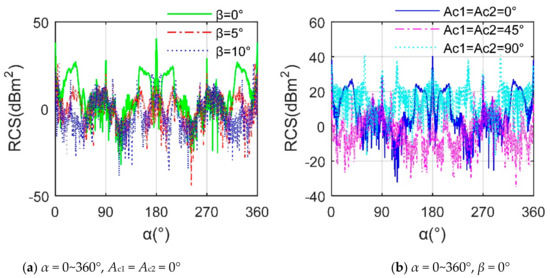 RCS curves of the tilt rotor aircraft, frh = 10 GHz, β = 0°, nr1 = nr2 = 1500 r/min. (a) RCS curve at α = 10°. (b) RCS curve at Ac1 = Ac2 = 36°.