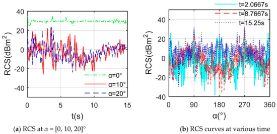 RCS of the tilt rotor aircraft, frh = 10 GHz, β = 0°, nr1 = nr2 = 1500 r/min, ωc1 = ωc2 = 10.472 × 10−2 rad/s. (a) RCS curves at RCS at α = [0, 10, 20]°. (b) RCS curves at various time.