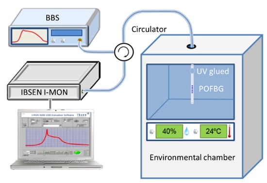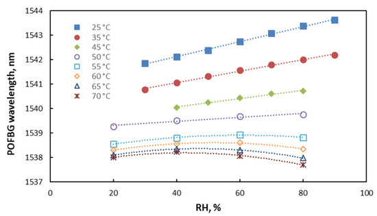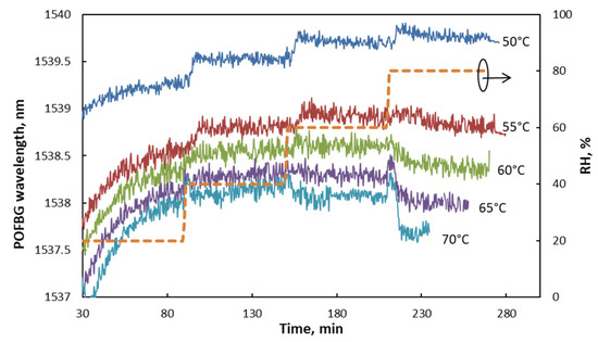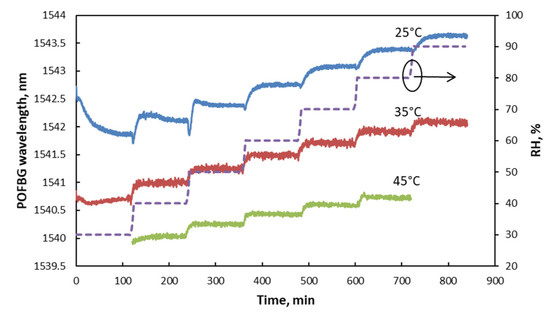 - Zhang, W.; Webb, D.J. Humidity responsivity of poly(methyl methacrylate)-based optical fiber Bragg grating sensors. Opt. Lett. 2014, 39, 3026–3029. [Google Scholar] [CrossRef] [PubMed]