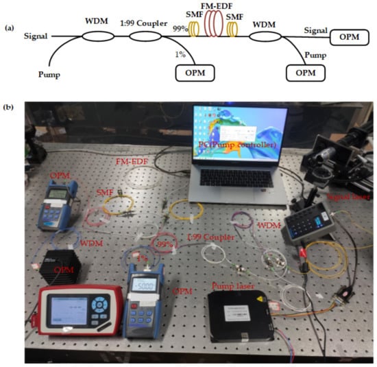 In principle, to measure the absorption coefficient of each mode, it is necessary to build up a few-mode experimental platform. However, few-mode devices are still very expensive at present. In this paper, we took advantage of the fundamental mode to calculate the effective erbium-ion concentration of the FM-EDF under test. The configuration and photo of the experimental setup are, respectively, shown in Figure 1a,b. As shown in Figure 1a, the signal and the pump were multiplexed into the 1:99 coupler by a wavelength division multiplexer (WDM). We measured the 1% port by an optical power meter (OPM) to calculate the powers input to the FM-EDF ( and ). The 99% port was linked with the input G.652 SMF, and then the amplified light through the FM-EDF was coupled into the output G.652 SMF. The output powers from the SMF ( and ) can be measured through the de-multiplexing ports. The pump power launched to the FM-EDF was controlled by a personal computer as shown in Figure 1b. After taking into account the coupling loss and excess loss, we could obtain the net input and output powers and then calculate from Equation (3).