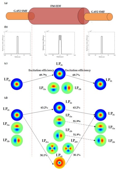 The FM-EDF used here had a concave refractive index profile in the core, different from the G.652 SMF, as shown in Figure 2a,b. The modal excitation and conversion at 1550 nm signal and 980 nm pump are illustrated in Figure 2c,d, respectively. The mode excitation efficiency was simulated by VPI software.