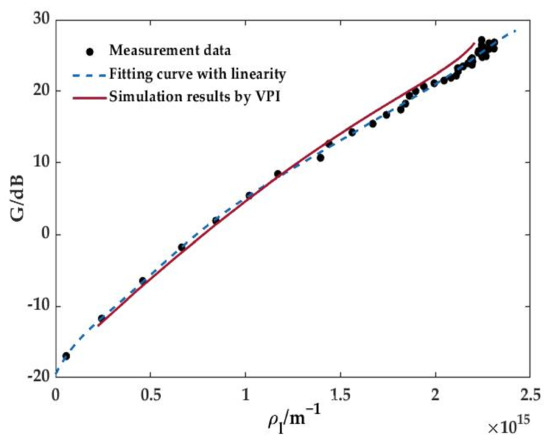 According to the effective erbium-ion concentration obtained previously, along with the erbium-doped fiber refractive index distribution and other experimental parameters, we simulated the gain characteristic of the setup shown in Figure 1 by VPI software. From Figure 3, the simulated results are basically identical to the experimental data. It is shown that the extrapolation method for the modal absorption coefficients is feasible, and then the effective erbium-ion concentration can also be estimated.