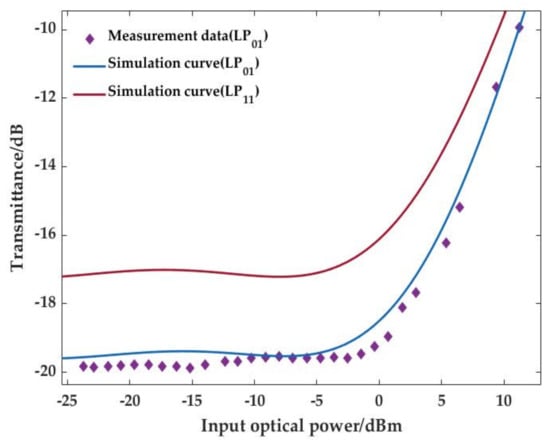 We also made use of the transmission method to measure the absorption coefficient of the LP01 mode by the single-mode experiment platform in which only 1550 nm signal light was injected into the SMF and FM-EDF. The transmittance, defined by the ratio of output to input powers of signal modes, was obtained by adjusting the optical power input to the FM-EDF. Under the case with no pump light, both optical amplification and ASE noise did not occur. In the experimental test, the 3.2 dB coupling loss and 0.4 dB excess loss between the SMF and the FM-EDF were introduced. The measured transmission of the LP01 mode is shown in Figure 4. For comparison, the simulated transmission curves of the LP01 and LP11 modes were also plotted in Figure 4, and the VPI simulation parameters were identical with those used in Figure 3. From Figure 4, the measured data were basically consistent with the simulated results for the LP01 mode. It was reconfirmed that the effective erbium-ion concentration calculated from the absorption coefficient was credible. From Figure 4, the transmission depends on the input optical powers and applied to the case with low input power. The absorption coefficient of the LP01 mode at the input power of −10 dBm could be calculated to be , which was close to the value of 2.38 m−1 obtained by our extrapolation method. Similarly, the simulated transmission coefficient was for the LP11-mode signal. In contrast, our extrapolation method was especially applied to the erbium-doped fiber under the operating states of pumping and amplification.