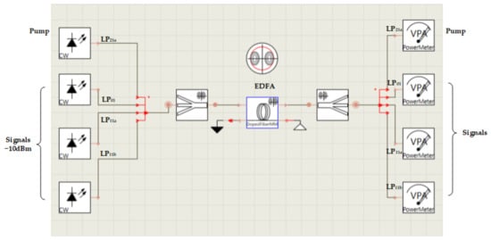 From Figure 2, the SMF supports the LP01 mode at 1550 nm and the LP01, LP11a, and LP11b modes at 980 nm. In contrast, the FM-EDF supports three modes (i.e., LP01, LP11a, and LP11b) and six modes (i.e., LP01, LP11a, and LP11b, LP21a, LP21b, and LP02) for the signal and pump light, respectively. For the fundamental-mode signal, the coupling or excitation efficiency between the SMF and the EDF was 69.7% (−1.6 dB) with no crosstalk. Under the pump case, the LP01 mode was converted to LP01 and LP02 modes in the FM-EDF, corresponding to the excitation efficiencies of 63.2% and 30.1%, respectively. The pump mode conversion had a great influence on the FM-EDFA’s gain or DMG, which was dependent on the average population inversion. A similar analysis was also applied to the EDF-to-SMF coupling. It should be pointed out that, for the LP01-mode pumping case, the pump coupling loss from the SMF to FM-EDF was 0.3 dB [15], different from the case of the FM-EDF-to-SMF coupling with the loss of 2.8 dB, since the two modes (i.e., LP01 and LP02) in the FM-EDF were simultaneously excited in different efficiencies. When the signal and pump powers’ input and output from the FM-EDFA were measured for the total population inversion, the coupling loss between the SMF and the FM-EDF was taken into account.