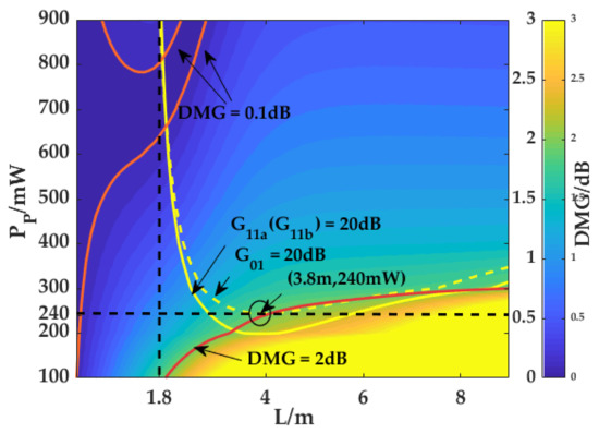 The contour lines of modal gain and DMG to optimize the pump power and the FM-EDF’s length.
