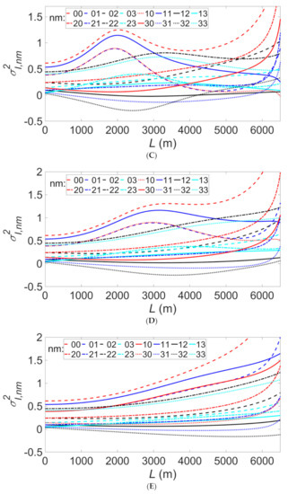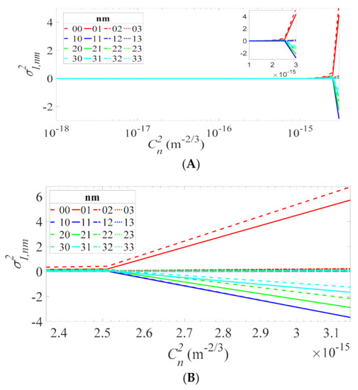 Figure 2 shows the 4 × 4 scintillation matrix elements σ2I,nm for a fixed range L but for varying values. Figure 2A presents the range from (negligible turbulence) to (strong turbulence). In the interval to , the scintillation index matrix elements exhibit sharp rises. The sharp increase in the scintillations in Figure 2 occurring for the values about can be explained by the joint effect of the source and the turbulence correlations when they become comparable in strength at the given distance (L = 500 m). Figure 2B gives the version of Figure 2A, zoomed to values of at which the scintillation changes begin. While eight curves are shown to substantially deviate from zero, the other eight curves remain very close to it.
