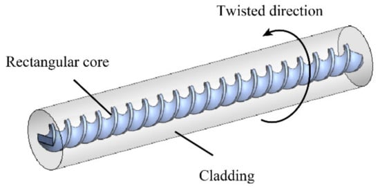 Unlike the traditional LPFG, HLPGs have the characteristic of periodic spiral refractive index modulation along the axis direction. Figure 1 shows a schematic diagram of a rectangular-core fiber HLPG in which the rectangular core was twisted into a helical path. The periodic spiral refractive index modulation is required to be written into the optical fiber during the preparation process of the HLPG. Ever since Kopp et al. made the first HLPG using a miniature oven, researchers have been exploring the manufacturing technology of HLPGs []. Accordingly, various methods for fabricating HLPGs have been reported, such as CO2 laser, hydrogen–oxygen flame heating, and arc discharge. In this section, the main methods of preparing HLPGs mentioned above are reviewed. Additionally, a comparative table (Table 1) is given at the end of this section to compare the characteristics of the different fabrication techniques.