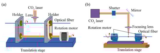 CO2 laser techniques also have some shortcomings, such as unilateral irradiation. The asymmetrical irradiation of the CO2 laser can produce uneven heating, which affects the quality of the grating. In order to avoid the asymmetrical distribution of the refractive index and bending of the fiber, Li et al. reported a double-sided CO2 laser manufacturing system to fabricate HLPGs []. A schematic example is shown in Figure 3b. In addition, Kong et al. demonstrated a promising technology and successfully fabricated a high-quality HLPG with a commercial fusion splicer []. The laser beam of the fusion splicer is split into two paths, which heat the optical fiber on opposite sides at a certain angle to avoid direct irradiation with each other. The fusion splicer also has a real-time feedback system to stabilize the CO2 laser, which can greatly reduce the power fluctuation and ensure a repeatable heating process.