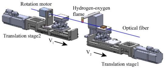Fu et al. proposed a high-efficiency fabrication method of HLPGs []. The high-quality HLPG can be obtained by using a hydrogen–oxygen flame heating system so that the grating can be cut into a series of sections to generate orbital angular momentum modes. An example of such an experimental setup is presented in Figure 5. In the fabrication system, a 1 cm long hydrogen–oxygen flame heat zone is used to heat the fiber, which is fixed on two different translation stages by a holder and the rotation motor. When the two translation stages move along the axial direction, a constant speed difference is maintained between them to avoid fiber bending during the fabrication process. Due to the diameter of the grating decreasing with the increase in velocity difference, their group designed an improved HLPG with different diameters [].