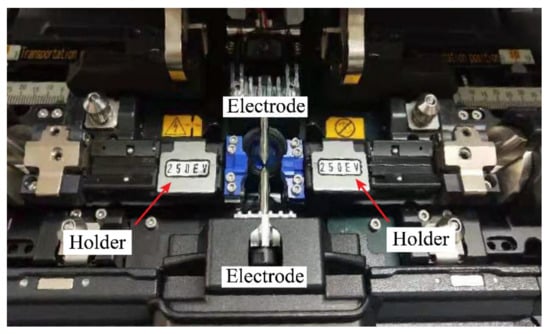 In 2017, Sun et al. confirmed the method of preparing an HLPG with arc discharge heating technology []. An automatic arc processing is realized by writing a designed program in a commercial fusion splicer. Because each component of the fusion splicer can be easily controlled by programming, this technology has high flexibility. In addition, due to the special high-precision motorized translation stages and rotation motors in the fusion splicer, the fabricated HLPG has good co-axiality. Figure 6 shows a partially enlarged view of a commercial fusion splicer (Fujikura (Tokyo, Japan) FSM-100P). In the fusion splicer, the electrodes are fixed, and two holders can move along the fiber axis driven by the translation stages.