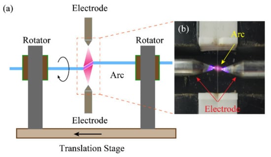 Poole et al. first reported an LPFG induced by arc discharge heating technology []. Owing to its flexibility and simplicity, the arc discharge heating technology has attracted wide attention in the fabrication of LPFGs []. Within arc discharge technology, several methods have been proposed, including the use of a fusion splicer and ignition coil [].
