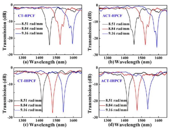 Transmission spectra of the (a) clockwise-twisted HPCF, (b) anticlockwise-twisted HPCF, (c) clockwise-twisted IHPCF, and (d) anticlockwise-twisted IHPCF with different twist rates. Reprinted with permission from [] © The Optical Society.