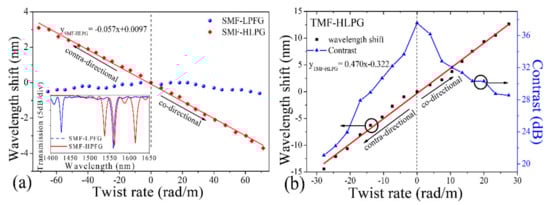 A torsion sensor with high sensitivity was fabricated using an HLPG written in two-mode fiber []. As shown in Figure 12b, the resonance wavelength of the grating shifted linearly, and the sensitivity was as high as 0.47 nm/(rad/m). Moreover, Zhang et al. compared the torsion characteristics of conventional LPFG with those of an HLPG written in the same SMF. Figure 12a shows that the SMF–HLPG had a higher torsion sensitivity than the SMF–LPFG. This may have been due to the advantages of the helical structure, and the period of the HLPG could be easily reduced or enlarged with the applied co-direction or contra-direction torsion.