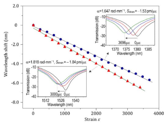 Wavelength shifts of the HLPG with increasing strain; the insets are the transmission spectra of the HLPG with different torsion angles. Reprinted with permission from [] © The Optical Society.