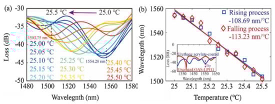 Excellent performance of a temperature sensor was realized by using a residual-stress-induced HLPG []. The sensor had a high sensitivity of 132.8 pm/°C, and it could measure from room temperature to 900 °C. In order to improve the sensitivity of temperature sensing, Yuan et al. proposed an ultra-high-sensitivity temperature sensor based on a urethane acrylate-coated off-axis HLPG []. Because urethane acrylate has a high thermo-optic coefficient and the refractive index is close to the cladding of SMF, the resonant wavelength had a high sensitivity to the temperature change. As shown in Figure 14, the resonant wavelength shift drifted rapidly when the temperature changed in the range of 25.0 °C to 25.5 °C. With the temperature rise and fall, the sensitivity could reach −108.69 nm/°C and 113.23 nm/°C.