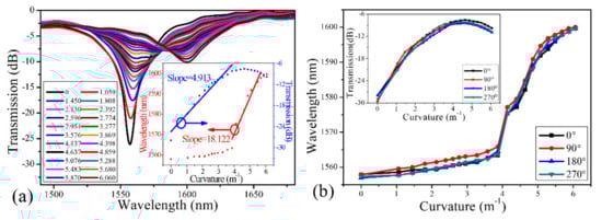 Wang’s group studied the bending characteristics of HLPGs made in different types of optical fiber. Using a twisted SMF, a high-sensitivity HLPG sensor was realized []. Due to the advantage of a helical structure in the fiber, the proposed sensor had higher bending sensitivity. When the curvature was increased to more than 2.1 m−1, a sensitivity of 12.62 nm/m−1 was obtained. Later, they also studied the bending characteristics of an HLPG which was written in a twisted two-mode fiber []. Results showed that the resonant wavelength of the sensor was linear with curvature, and the bending sensitivity was 12.409 nm/m−1. Subsequently, an HLPG was fabricated by twisting a double-clad fiber with a CO2 laser []. The fabricated HLPG was found to have a response to the curvature with a maximum bending sensitivity of 18.122 nm/m−1. As shown in Figure 15a, when the curvature increased, the grating contrast decreased gradually. This may have been due to the photoelastic effect caused by bending, which led to asymmetric index variation in the fiber. In addition, the sensor could overcome the dependence of the bending characteristics on the bending directions, as shown in Figure 15b. A summary of the presented curvature sensors with their comparative information is listed in Table 5.