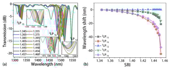 SRI measurement is crucial in the chemical engineering [,,] and biomedical fields [,]. An SRI sensor based on a screw-shaped HLPG was fabricated by means of a femtosecond laser system []. The refractive index sensitivity of the screw-shaped HLPG was approximately 48–51 nm/RIU in the range of 0–70% glycerin concentration. Although the HLPG produced by the femtosecond laser system used single-path scanning, it took a longer time than that produced by CO2 laser.