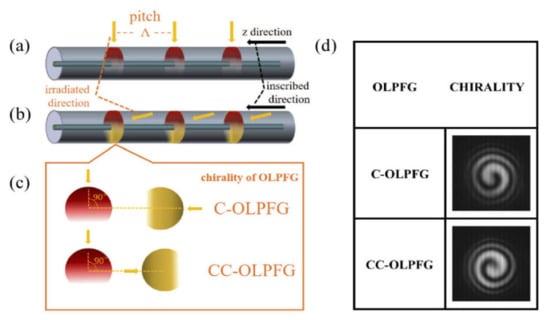 - Xu, H.; Yang, L. Conversion of orbital angular momentum of light in chiral fiber gratings. Opt. Lett. 2013, 38, 1978–1980. [Google Scholar] [CrossRef]
