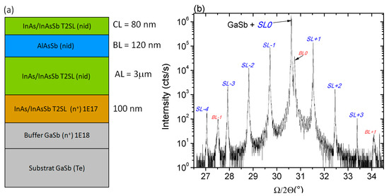 (a) Stacking of the XBn InAs/InAsSb T2SL structure grown by MBE on GaSb substrate. (b) HR-XRD pattern of the T2SL detector structure. The lattice mismatch with the GaSb substrate is −354 ppm.