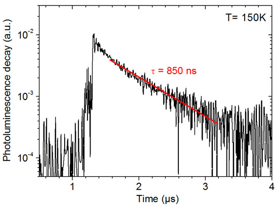 The other material characterization measurements have already been reported elsewhere [11], except the TRPL measurement performed on the whole XBn structure, for which a minority carrier lifetime value of 850 ns was extracted at T = 150 K (Figure 2). For this measurement, a pulsed laser at 1.55 µm (full width at half maximum equal to 5 ns) is used to generate the PL signal, which is collected with reflective optics and focused on an HgCdTe photodiode with a response time constant lower than 50 ns. The PL decays are sampled by a digital scope and averaged. The minority carrier lifetime is extracted by fitting the experimental signal by an exponential decay [18].