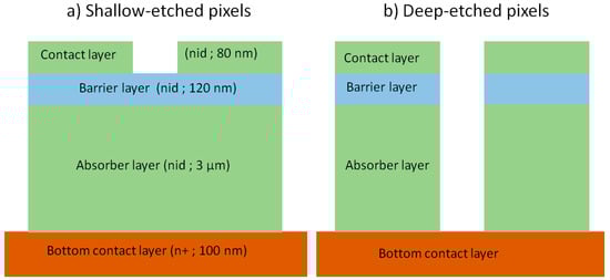 To study the influence of etching depth on electrical and electro-optical performances of an XBn Ga-free T2SL photodetector, two kinds of single-pixel devices were fabricated: shallow-etched pixel down to the BL and a deep-etched single device below the AL (Figure 3).