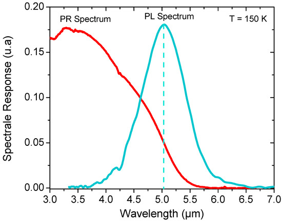 Next, the samples were wire bonded onto a pin LCC and placed in a LN2-cooled JANIS cryostat. To determine the cut-off wavelength of the detector, the relative spectral photo-response (PR) of the device, under front-side illumination, was measured as a function of bias and temperature using a Fourier transform infrared (FTIR) spectrometer. Figure 4 shows non-calibrated PR spectra performed at 150 K at operating bias V = −400 mV and the photoluminescence (PL) spectrum.