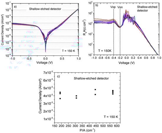 Shallow-etched photodetectors: (a) dark current density voltage characteristics performed on different detector sizes at 150 K; (b) differential Resistance Area product (RdA) product as a function of the voltage at 150 K; (c) dark current density value as a function of the perimeter to area ratio (P/A), extracted at Vop = −400 mV.