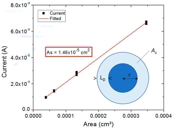 To estimate the lateral diffusion length from electrical measurements, we have applied in Figure 6 the method used by Plis et al. [20]. If lateral diffusion is present, every mesa detector has the additional surface area As around the periphery of the detector which, in the case of circular mesas, can be expressed as: