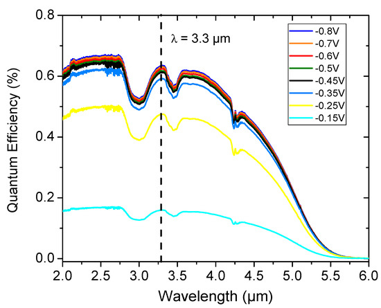 Considering the additional surface area of the shallow-etched detector with a 210 µm mesa diameter, spectral responsivity measurements, under front-side illumination, were performed at 150 K. Figure 7 shows the spectral quantum efficiency (QE) at reverse bias ranging from −0.15 V to −0.8 V. The non-zero operating bias value, required to turn on the full spectral response, is probably due to the presence of a valence band offset (VBO) at the barrier and absorber layers interface, blocking the transport of holes to the CL [23]. The QE starts to saturate at −400 mV, confirming the Vop value deduced in Figure 5b. Concerning the increment of the QE with the bias, this behavior is due to the increase in depletion width within the AL, allowing for a larger collection of carriers assisted by the electric field. Without anti-reflection coating, QE values as high as 60% at λ = 3.3 µm were obtained, in agreement with the state-of-the-art QE values [3,6,8,9]. These QE values could be enhanced by the optimization of the electron and hole wavefunction overlap associated to the fundamental conduction and valence minibands of the T2SL structure by reducing its period thickness while increasing the antimony composition of the InAs/InAsSb heterostructure and keeping the target 5 µm wavelength cut-off [24].