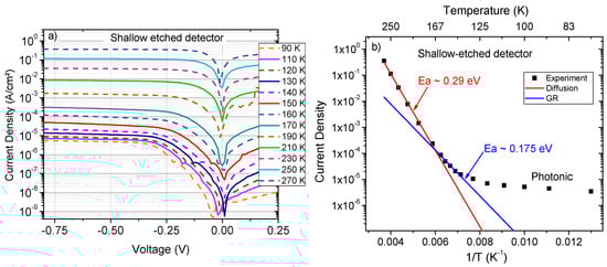 (a) Dark current density measured for a shallow-etched device with a 210 µm diameter at different temperatures; (b) temperature dependence of dark current density at −0.4 V.