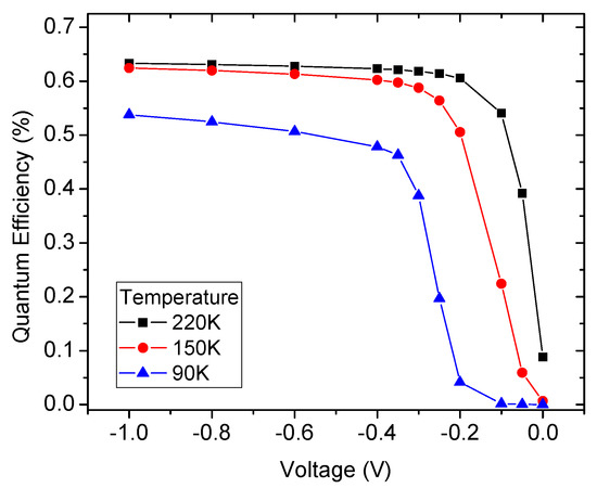 Figure 9 presents QE values measured on the deep-etched photodiode (210 µm mesa diameter) at 150 K for different applied biases. Without surface area correction, a QE as high as 60% at 150 K is observed, similar to the one of the corrected shallow-etched device. Therefore, the etching through the total thickness of the AL allows for the electrical and electro-optical isolation of each pixel with its effective surface area. An increase in the QE with the temperature, from 47% at 90 K to 62% at 220 K, is observed. This QE increment with temperature is due to the increase mobility of minority carriers and therefore in vertical diffusion length at temperatures higher than 90 K [6,21,25].