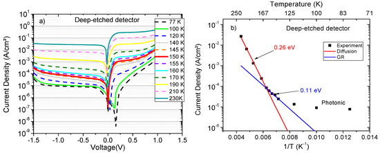 (a) Dark current density characteristics measured for a deep-etched device (mesa size 210 µm) at different temperatures from 77 to 230 K; (b) temperature dependence of dark current density at −0.4 V.