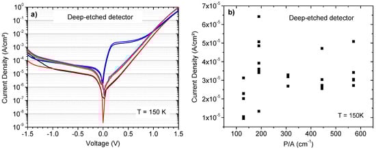 Finally, Figure 11a shows dark current density as a function of applied bias at 150 K of deep-etched detectors with different sizes ranging from 60 to 210 µm, and Figure 11b reports the value extracted at −400 mV as a function of P/A ratio. Compared to the shallow-etched device, the results are much more dispersed but the deep etching seems not to degrade the electrical performance. Indeed, dark current densities vary from 1 × 10−5 A/cm² to 6 × 10−5 A/cm² at 150 K. A dark current density as low as 1 × 10−5 A/cm² is only 7.5 times higher than the one extracted from the MCT Rule 07 [26] and such a value is among the lowest dark current density values recently reported [3,6,8,9]. However, for some devices, forward bias characteristics clearly show a signature of surface leakage current and, combined with the dispersion of results, the deep-etching process seems therefore less robust and less homogeneous than the shallow-etching one. Consequently, the deep-etching process of sidewalls sometimes degrades the electrical behavior of the pixel detector. An efficient passivation procedure is required for the fabrication of pixels, particularly in the case of high-format FPA for which the isolation of small pixels is necessary.