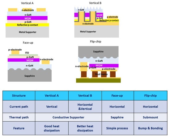 The bandgap of GaN and AlN are 3.4 and 6.2 eV, respectively. As the composition changes, the bandgap of AlGaN can range from 3.4 to 6.2 eV, which means that the material of AlGaN is very suitable for the fabrication of UVC LED devices [6]. An LED is a semiconductor light-emitting device based on a pn junction. The p-type and n-type layers are used to inject holes and electrons into the active region between them. Based on the device fabrication, we can separate UV LED chips into three types of device structures, namely, face up, flip-chip, and vertical type, as shown in Figure 1. The vertical type is more complicated in terms of fabrication: the wafer must first be mounted on a conductive support, followed by a top-side process, and then, the removal of the sapphire substrate. Although this set-up can result in good heat dissipation, the vertical design costs about three times as much as the other two types. By contrast, the fabrication process of the face-up chip is simple but does not lead to efficient light extraction and good quantum efficiency because of the p-metal shading part of the light and a worse current path. Therefore, the most commonly used UVC LED typically has a flip-chip structure; i.e., a substrate leads light at the top, whereas an electrode is connected to a circuit below. This structure can achieve better heat dissipation.