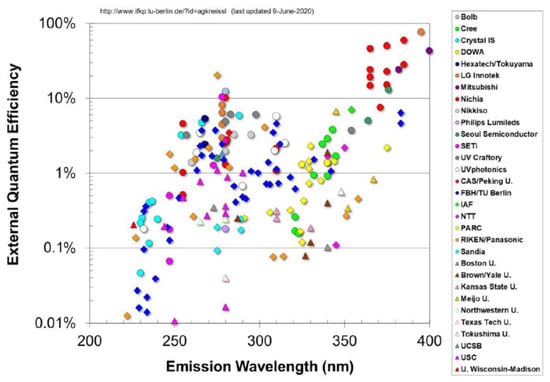 EQEs of UV LEDs in spectral range between 200 and 400 nm [7].