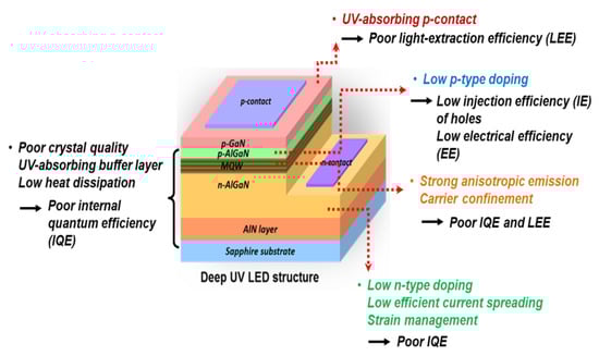 In this equation, ηi (IQE) is the ratio of the number of photons generated in the active zone (nph) and the number of injected electrons (ne) with unit time, and ex (LEE) is the ratio of the number of photons entering the outer space and the total number of generated photons. Therefore, the EQE of LED chips is closely related to the chip quality and LEE. However, as the emission wavelength changes from blue to UV, the ηi of the group nitride LED chip usually gradually decreases [15]. In UVC LED sterilization and disinfection equipment, the radiation illuminance of a single UV LED often does not fulfill the inactivation dose requirement, which must be compensated by multiple integrated packages. Although the UVC LED chip has a device structure similar to that of the blue LED, the higher Al composition of the former significantly differentiates its chip quality from that of the latter, such as the lower LEE, which comes from the larger mismatch in the MQWs. At present, EQE improvement of UVC chips remains subject to the following bottlenecks, as shown in Figure 3.
