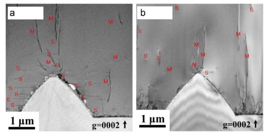 Bright field cross-section TEM images of (a) UV-LEDs with GaN nucleation layer and (b) UV-LEDs with sputtered AlN nucleation layer, g = 0002. S indicates screw dislocation and M indicates mixed dislocation [26].