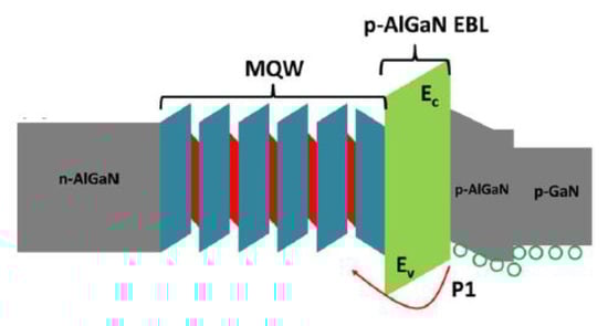 Another way of improving IQE is through setting up an EBL with a high electron barrier between the active region and the p-type layer, which can alleviate electron overflow to a certain extent [67]. However, the electron blocking layer will also reduce the emissivity of holes. Figure 5 shows a typical DUV device energy-band structure with a p-AlGaN blocking layer [68]. A similar structure was designed by the team of Ge Weikun of Beijing University as a multilayer electron barrier layer with gradual changes in thickness and Al composition. While suppressing the overflow of electrons, it also increased the emissivity of holes and greatly improved quantum efficiency [69]. Meanwhile, Hu et al. reported that an electron deceleration layer with a superlattice structure can be added between the n-type layer and the active region to alleviate the electron overflow effect [70]. Other innovative methods that have achieved good results include that developed by the team of Dai Jiangnan of Huazhong University of Science and Technology, who replaced the p-type layer monolithic integration technology with a multiplicative photoelectric converter (MPC), which can absorb part of the active area emission [71].