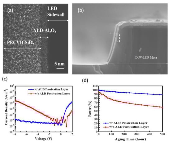 GaN-based blue LEDs have a long life with the Mean Time Between Failure (MTBF) up to 50,000 h [84]. However, UVC LEDs have larger lattice mismatch between AlGaN layers; therefore, its reliability is much shorter than GaN-based blue LEDs [84]. To attain maximum light output and long operating lifetime, LED chips require surface passivation to eliminate parasitic currents caused by traps and defects. In addition, a barrier coating is typically necessary because LED materials are sensitive to moisture. Atomic layer deposition (ALD) is an ideal technique to manufacture both the passivation and barrier films. In particular, when the LED sizes diminish to micrometer dimensions, it is the only coating method that is capable of producing high-quality films on the required minuscule scale. Ultra-thin, pinhole-free ALD films do not suppress the LED light intensity and provide reliable protection against ambient conditions, whereas their superior conformality ensures no thickness variations between the facets of the LED chip. Thickness variations, which are typical side effects of other coating methods, can potentially lead to uneven distribution of film stress or thermal expansion behavior and physical damage to the chip. In one study, deep UV LED chips were covered via SiO2/Al2O3 passivation, SiO2 deposited via PECVD, and Al2O3 deposited via ALD. Good step coverage was observed in the mesa surface of the DUV chip, of which the SEM microscope images are shown in Figure 6a,b. Meanwhile, leakage current under reverse bias was found in the chip subjected to ALD passivation, and the current density was measured to be approximately 10−6 A/cm2, as shown in Figure 6c. The chips shown in Figure 6c were subjected to an aging test after stressing at 25 °C, 50 mA, and 60% humidity. The chips with ALD coating exhibited less than 10% power drop; whereas the control chips without ALD film exhibited approximately 40% power drop by the 500 h of stressing, as shown in Figure 6d.