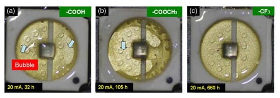 Bubbles appearing after reliability tests for 32, 105, and 660 h followed by heating up to 230 °C for the p-BVE with –COOH, –COOCH3, and –CF3 end groups, respectively. Reliability tests were conducted using 265-nm LEDs at operation current of 20 mA [86].