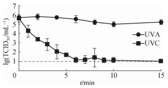 After the Severe Acute Respiratory Syndrome (SARS) epidemic in 2003, research on the ability of UV to inactivate coronavirus has gained popularity. In 2004, the US Food and Drug Administration conducted a comparative study on mainstream virus inactivation methods [91]. In this study, a 254-nm UVC radiation source and 365-nm UVA light source irradiated two groups of samples from a distance of 3 cm. Each group of samples contained 24 virus culture dishes placed on ice. The experimental results are shown in Figure 8. In the control group irradiated with UVC, half of the tissue culture infectious dose (TCID50) decreased after 1 min, dropped to less than 0.01% of the initial value at 6 min, and remained at this level for 15 min after continued irradiation. The virus was completely inactivated at this stage. However, no significant decrease in TCID50 levels was observed in the UVA-irradiated control group. This indicates that the UVC band in ultraviolet light has a significant inactivation effect on the coronavirus. In addition, for comparison, high-temperature inactivation at 56 °C was demonstrated to require 20 min to achieve the effect of UVC irradiation for 6 min. The aforementioned results show that UVC disinfection is more efficient than high-temperature disinfection. However, more detailed irradiance comparisons and comparative studies on the inactivation effects of different UVC wavelengths have not been reported.