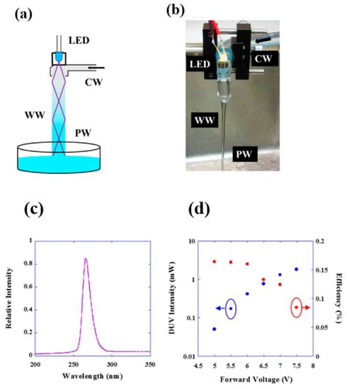 (a) Schematic diagram and (b) photograph of the water waveguide purification system, (c) emission spectrum of the deep-ultraviolet-LED, and (d) DUV intensity (blue circles) and wall-plug efficiency (WPE) (red circles) versus forward voltage [99].