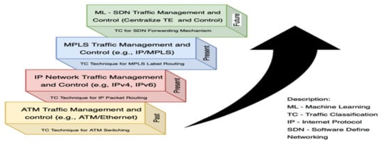 Smart environments powered by the internet of things offer a wide range of services to benefit society, including smart homes, smart buildings, smart cities, smart grids, and more. However, the proliferation of IoT creates a critical problem. Network operators in smart environments have difficulty determining which IoT devices are connected to their network and finding out what each device is doing by default, as devices are usually distributed across different sectors [7]. Internet service providers (ISPs) and network operators are often interested in determining the amount of traffic, network performance, and devices connected by their networks to improve security [8]. Moreover, Internet traffic classification is valuable, particularly for the smart environment that occupies many IoT devices. Therefore, network traffic classification is a noteworthy topic in machine learning approaches. Initially, port-based approaches are used to classify network traffic based on ports by employing sophisticated statistical and behavioral approaches that thoroughly analyze network traffic using machine and deep learning approaches [9]. Traffic classification is an important part of large-scale data analysis and plays an important role in ensuring network security and defending against traffic attacks. Whenever a new device connects to the network, it must quickly be managed and protected using the associated security mechanism or QoS policy. Therefore, a major challenge is to differentiating IoT/non-IoT devices in minutes. Unfortunately, there is no clear indication that a device on a network is an IoT. Hence, we use a machine learning approach, where we trained classifiers on the seen dataset of labeled IoT/non-IoT devices, and then analyze the accuracy of our classifiers on an unseen dataset of devices. Consequently, deploying traffic classification in more intelligence networks is becoming more difficult to achieve, because learning to perform control beyond the local domain, from nodes with only a partial view of the entire system, is extremely complex. The recent advancements in SDN will ease the complexity of learning. Figure 1 depicts the roadmap of the traffic classification direction of the new paradigm architecture of the networks. The major advantages of ML-SDN traffic classification compared with ATM-, IP-, and MPLS-based TCs are: more precisely, SDN enables (1) centralized visibility, which includes global network information (e.g., network resource limits or dynamically evolving network status) and worldwide application data (e.g., QoS requirements); (2) programmability without the need to manage individual infrastructure elements, i.e., it is possible to proactively program OF switches on the data plane; (3) openness, in which data plane components (i.e., OpenFlow switch-es) communicate with the controller via a single interface for data plane programming and network information gathering, regardless of vendor; (4) various flow table pipelines in OF switches will increase the versatility and effectiveness of flow management. Furthermore, network traffic classification can help improve the performance and QoS of IoT devices.