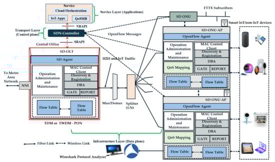 Figure 2 shows the IoT over a converged FiWi network communication architecture. As explained earlier, the bilateral transmission of H2M/M2M packets crosses internet segments, including optical access networks and embedded software-defined optical access points. (SD-ONU-APs). This architecture consists of three respective layers, such as a service layer (application), transport (control plane) layer and infrastructure layer (data plane); it also consists of two interfaces, i.e., SBAPI and NBAPI. The service layer is responsible for providing different services for the clients. The transport layer is responsible for transmitting and receiving the data packet information from the applications orchestrating the client to the SDN controller. The infrastructure layer (data plane) is where the actual physical transfer of control and data packets takes place. The operation administration and management (OAM) system consist of an optical back-end with a single or multiple optical network in its (SD-OLT) located in the central office, which serves single or multiple optical network units (SD-ONU/SD-ONU-AP) on the customer premises. An MUX/DEMUX is used to combine/split the signal in order to drive one or more wavelengths. The feeder fiber line is divided by the power splitter in order to meet the distributed ONU-APs [27]. An advanced SD-ONU-AP that maintains the generic SD-ONU-AP ability and includes an integrated OpenFlow agent and tunable transmitter. An Ethernet passive optical network (EPON)-based back-end is employed, with its typical tree and branch topology. A branch of ONUs may also be located at residential and business subscribers’ premises, delivering FTTx services (e.g., fiber to home/buildings) to one or more wired subscribers. Another segment of the SD-ONU-AP is equipped with Wi-Fi mesh networks that consist of mesh and access points to cover the user within the coverage area by radio and fiber technologies (R&F). The end-user IoT devices exchange their sensitivity and surveillance data in the same way as regular front-end user devices with FiWi infrastructures. Typically, front-end IoT device communication is directly connected to wireless SD-ONU-AP.